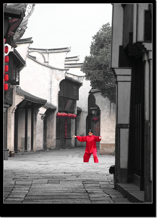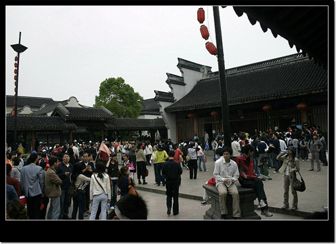 早上很早就起了,来到楼台,欣赏烟雨江南。上午时分,游客越来越多,天也晴了,接近中午到来的客人绝不会了解,前一个夜下了一场合适的雨。整个乌镇立刻一片热闹的景象,到处可见导游的小黄旗子,在每一个景点说着重复了无数次的文和英的故事;肩膀和肩膀的缝隙中,满是举着数码相机拍照的人们,我在民家水边高高的楼台上远远地望着不一样的乌镇。喝着菊花茶的我偶尔举起机子掐两张,也有游客掐着楼台上的我,因为,我们已经成为彼此眼光中的风景了。 43 烟雨江南